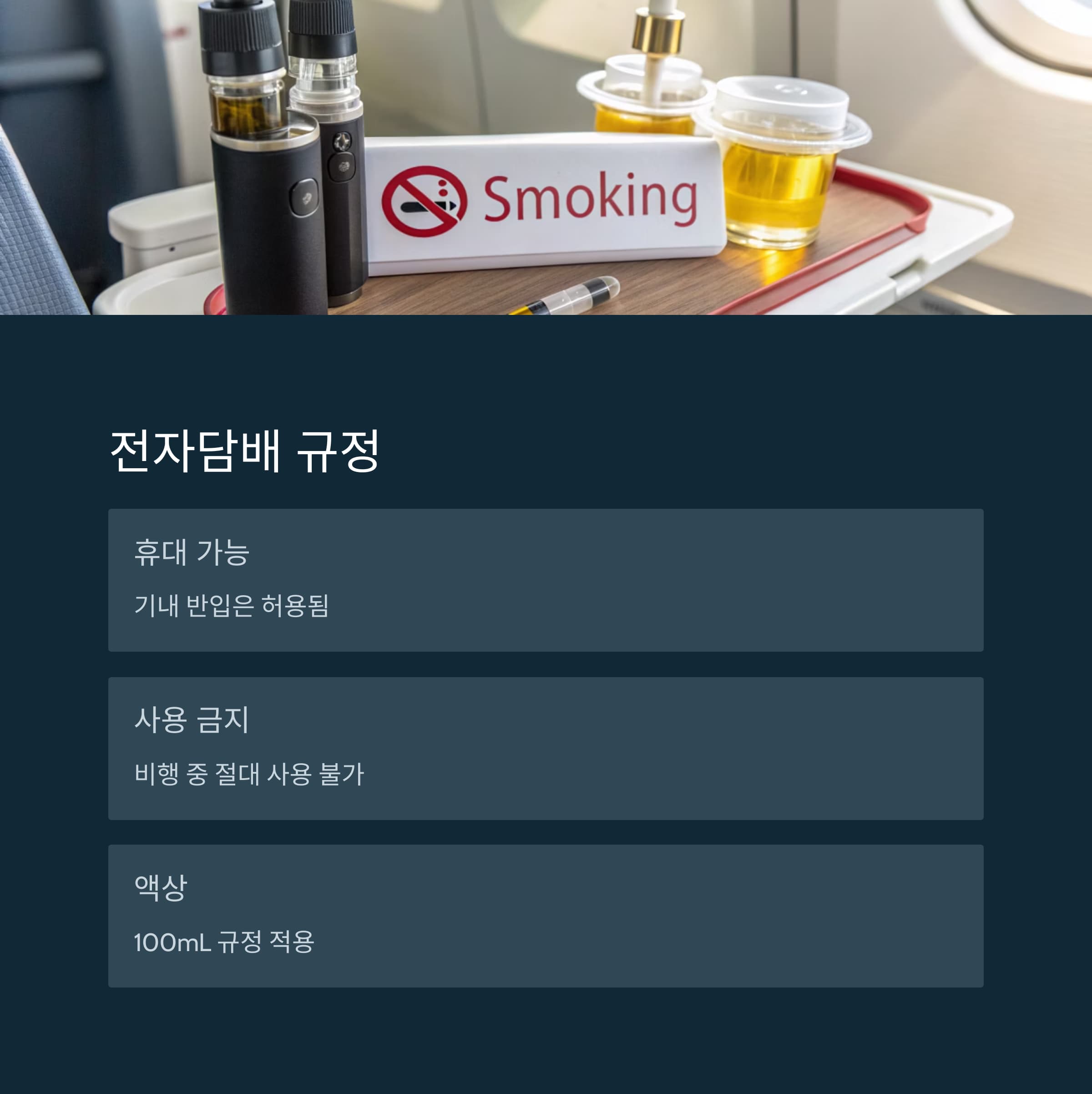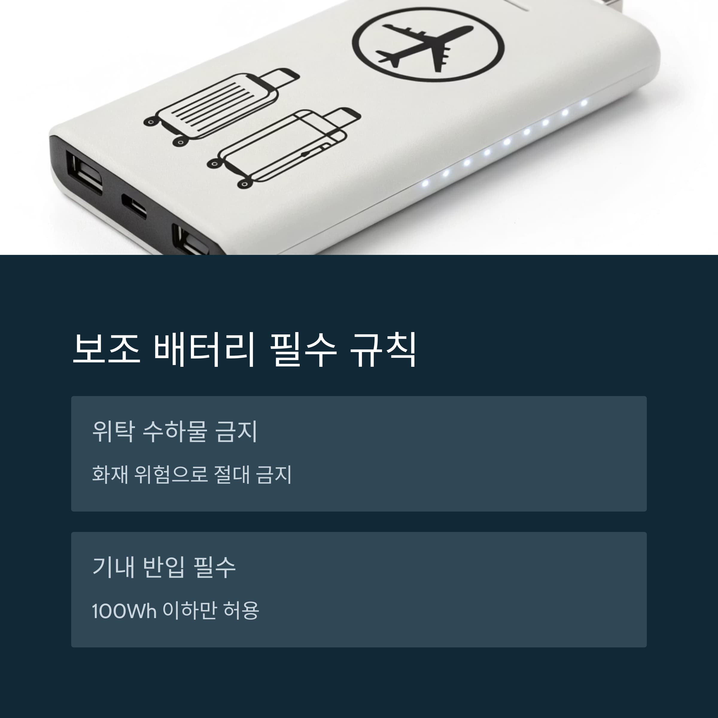 | 보조배터리 규정 | 100Wh 이하만 기내 반입 가능하며, 위탁 수하물로는 불가합니다. |