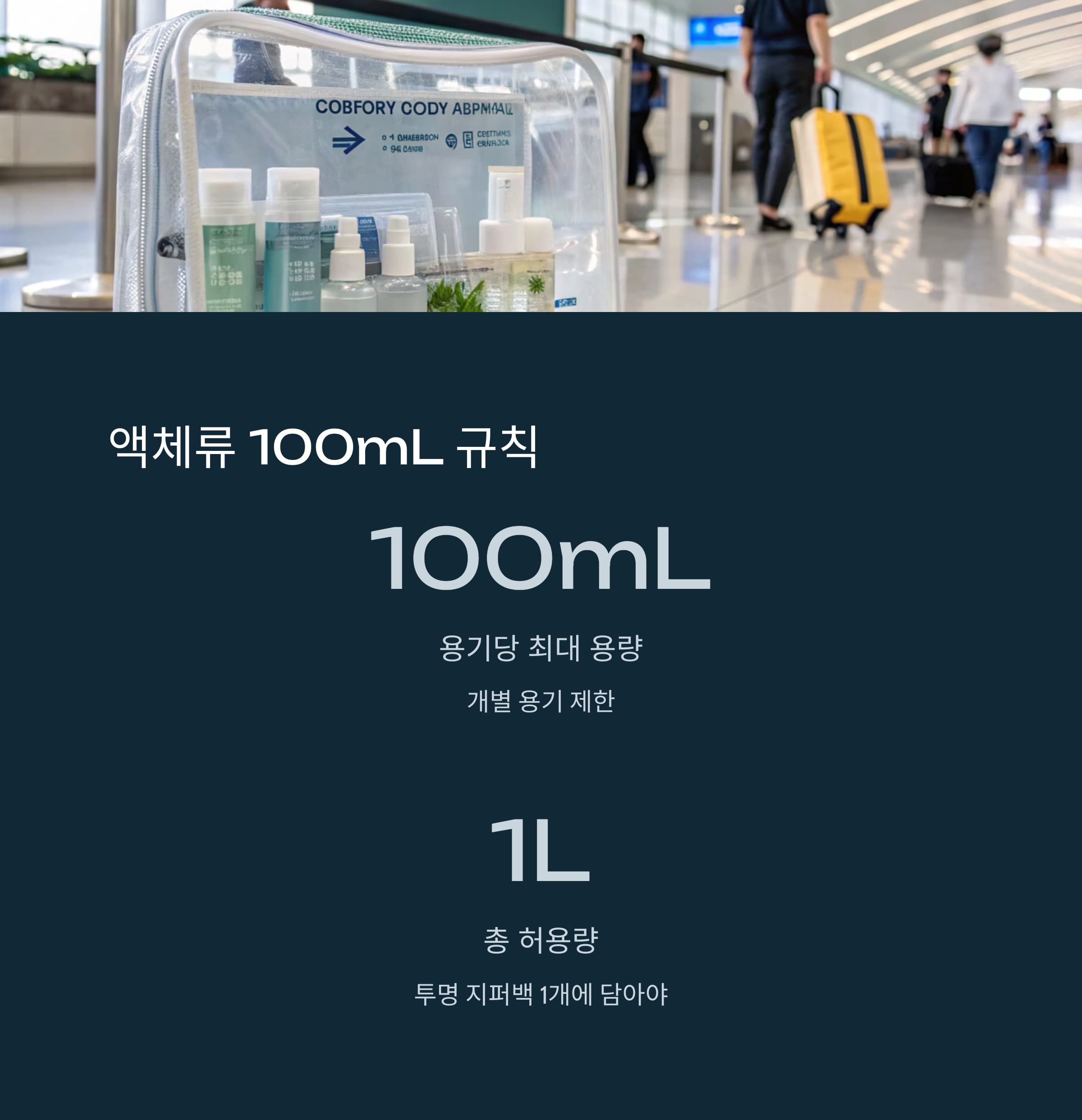 | 액체류 제한 | 개별 용기당 100ml 이하, 총 1L까지 지퍼백에 담아야 합니다. |