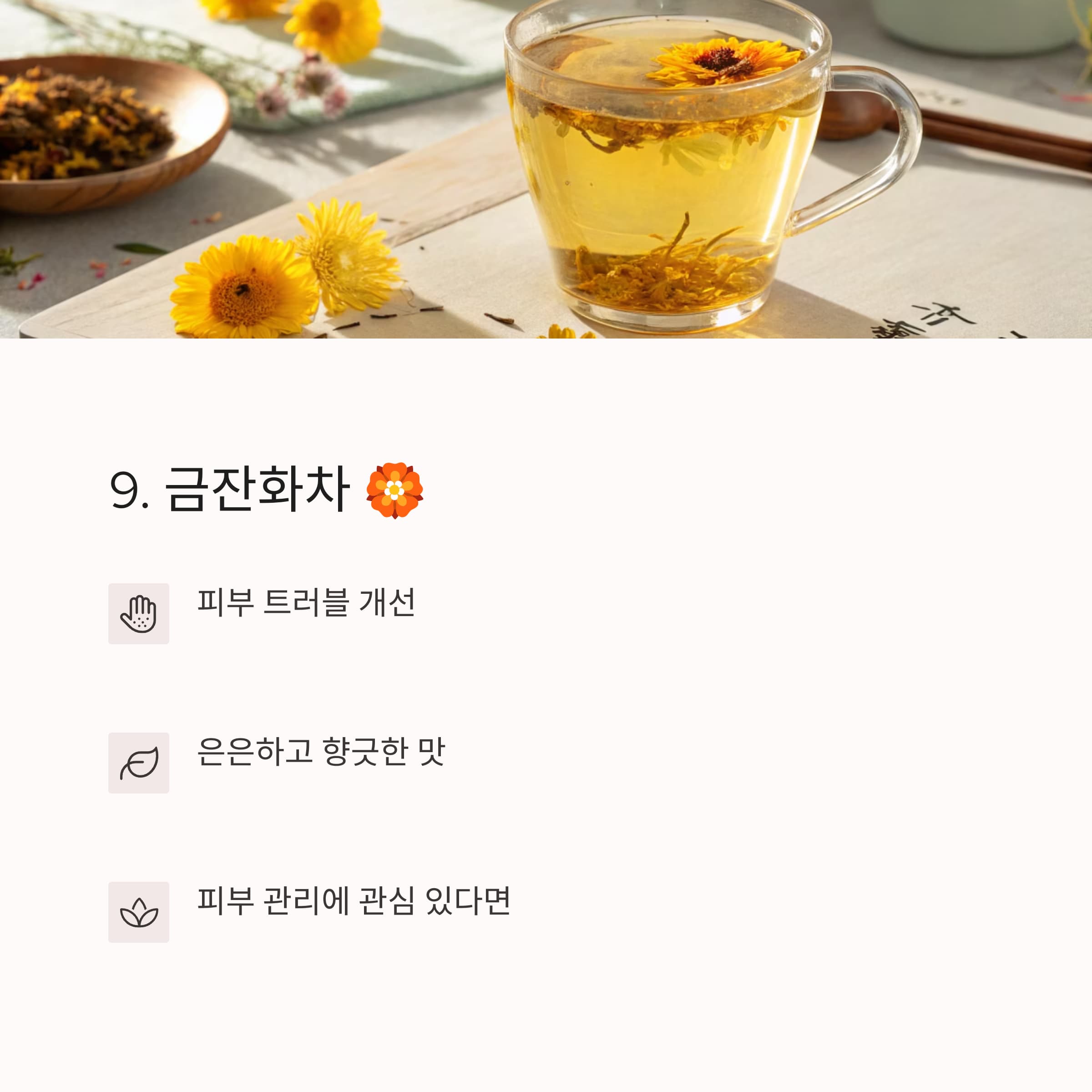 메리골드는 항염, 항균 작용이 있어 구강 염증이나 인후통에 도움을 줍니다.
