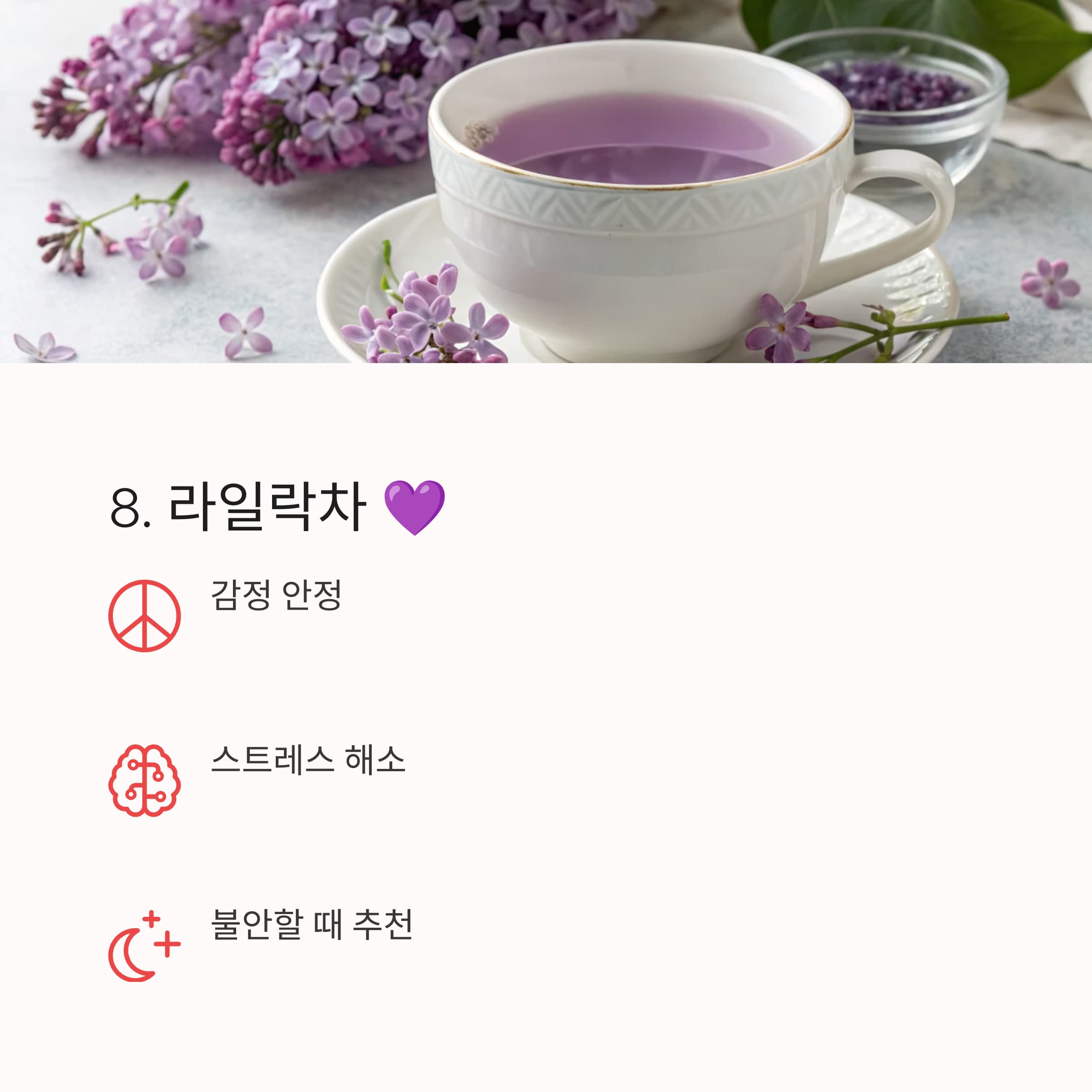 라벤더는 긴장을 풀어주는 효과가 뛰어나며, 불안감을 완화하고 숙면을 돕는 차로 알려져 있습니다.