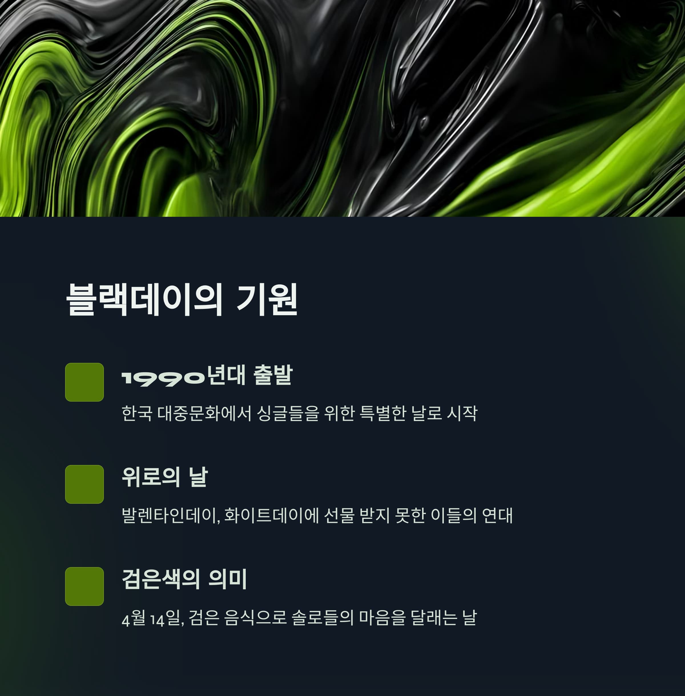 블랙데이는 매년 4월 14일에 기념되는 대한민국의 독특한 비공식 기념일로, 발렌타인데이(2월 14일)와 화이트데이(3월 14일)에 선물을 받지 못한 사람들이 짜장면을 먹으며 위로를 나누는 날입니다.