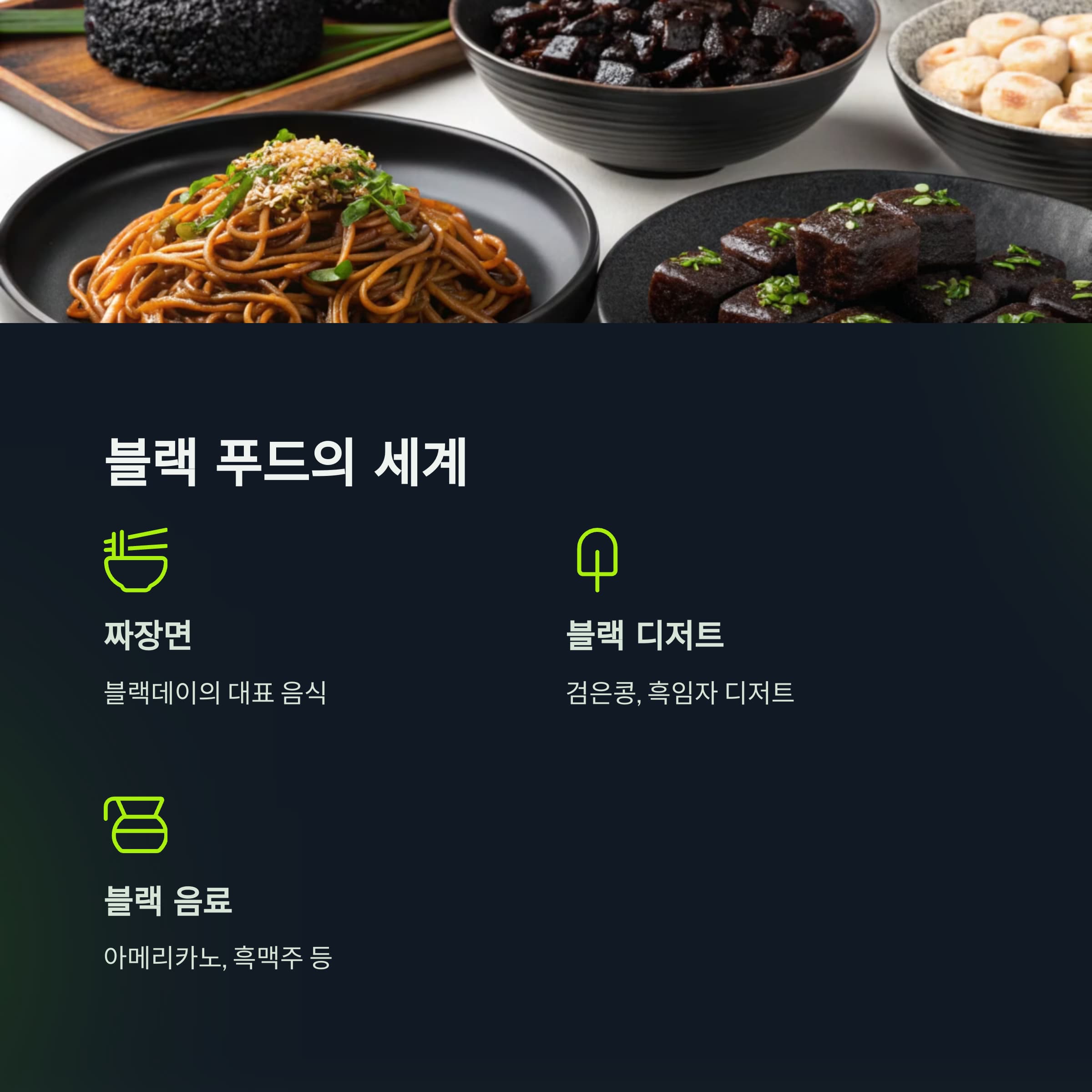 예를 들어, 일부 레스토랑에서는 블랙 푸드 파티를 열거나 블랙데이 특별 세트를 판매하기도 합니다.