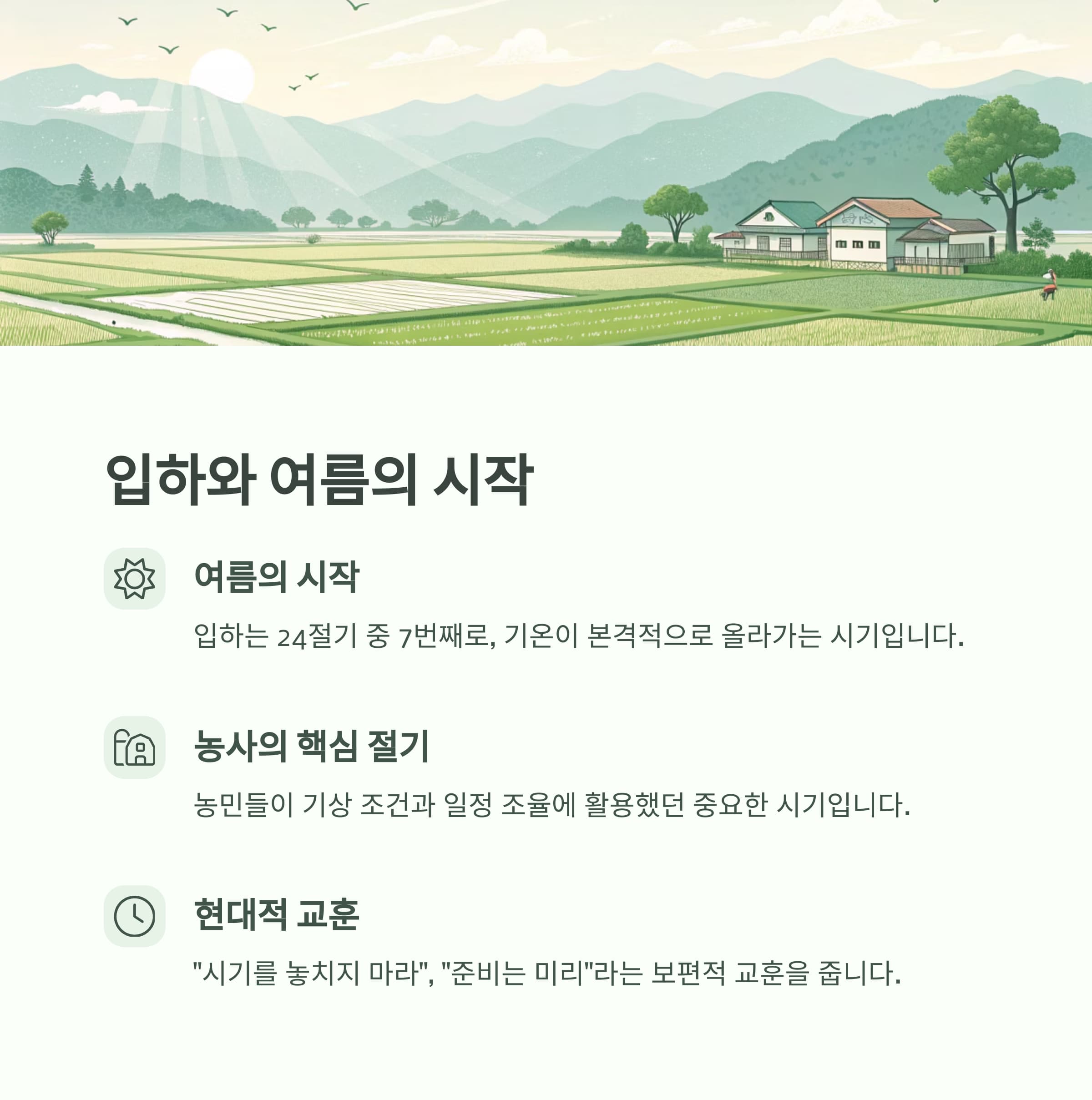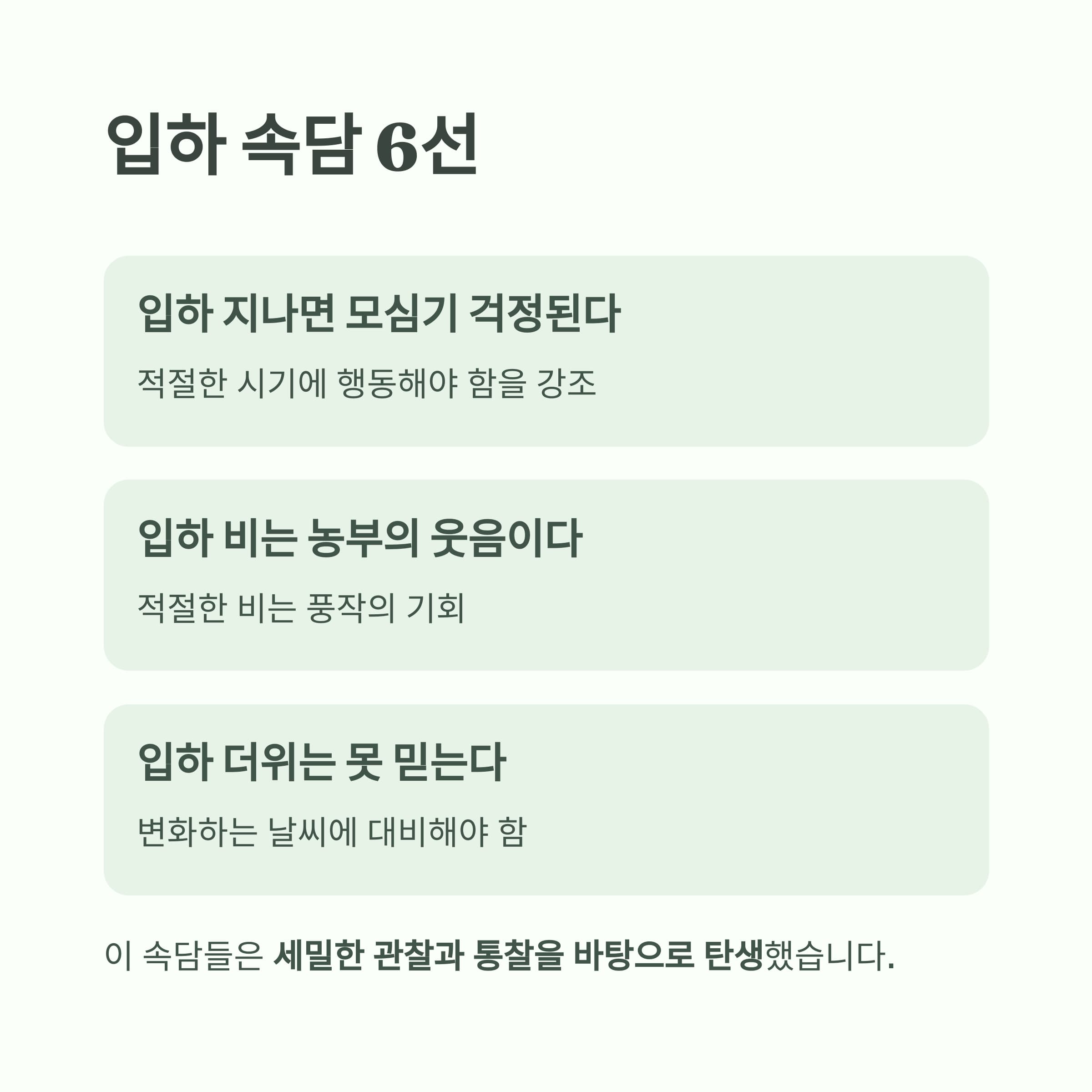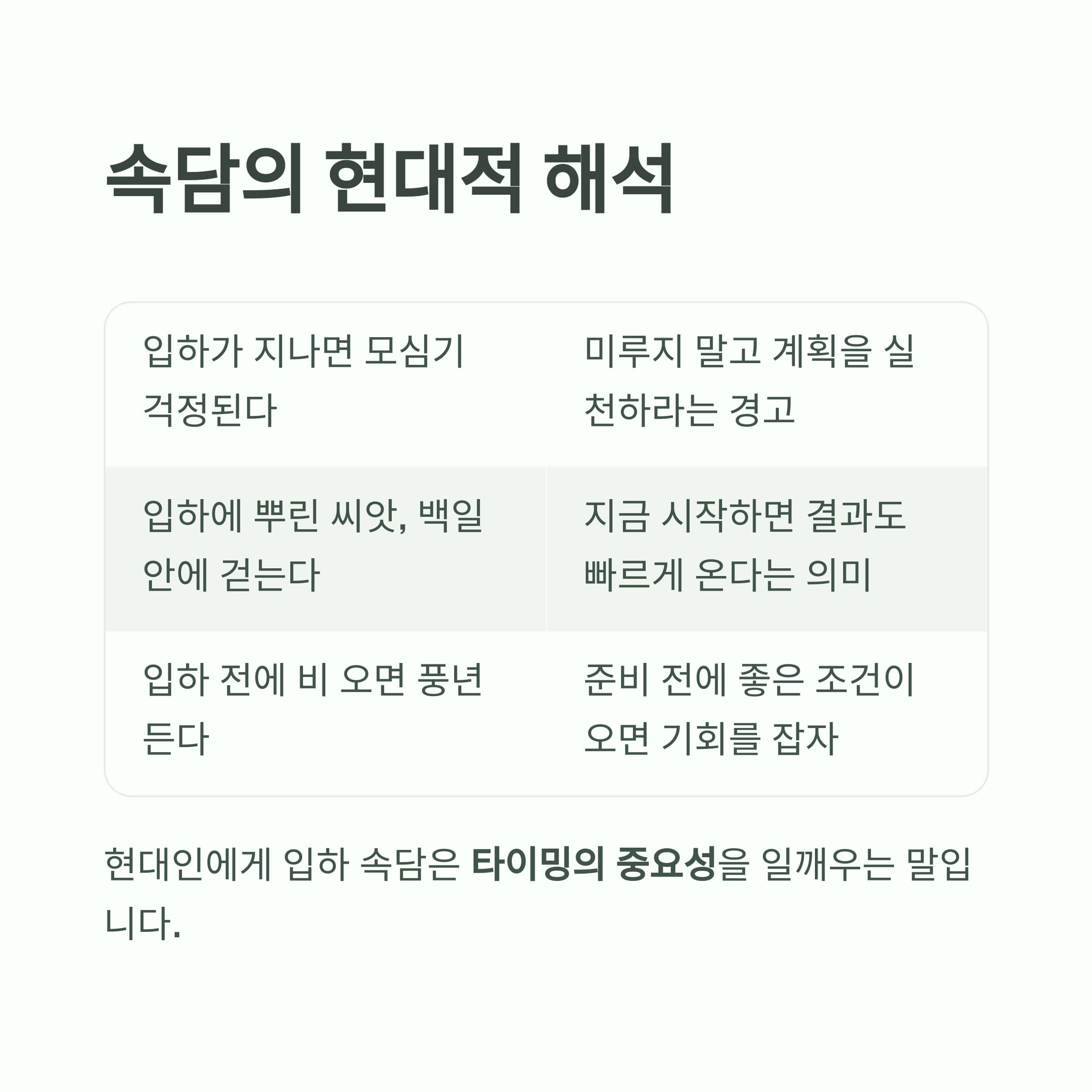 현대인에게는 입하 속담이 '타이밍의 중요성'을 일깨우는 말이 됩니다.