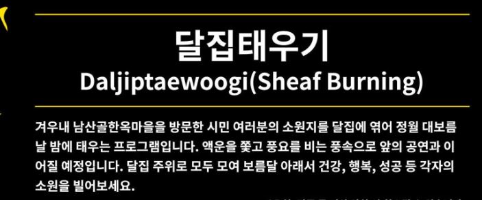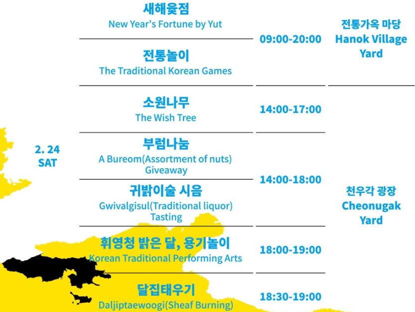 | 서울 | 남산골한옥마을 <휘영-청> | 2.24(토) | 서울 도심 한복판에서 액운을 쫓고 올 한 해 복을 기원 |