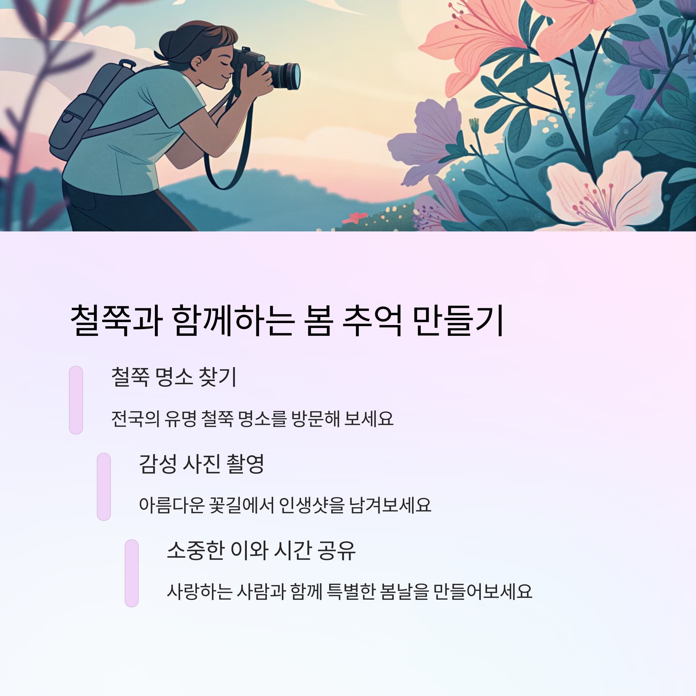 | 철쭉꽃 촬영 팁 | 자연광을 활용하고, 배경을 단순하게 구성하여 꽃의 색감을 강조하세요. |