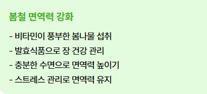 - 봄나물 섭취: 냉이, 달래, 쑥 같은 봄나물을 활용한 요리를 즐기면 면역력 강화에도 좋습니다.