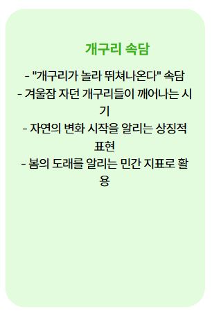 이는 경칩이 되면 겨울잠을 자던 개구리들이 깨어나면서 자연의 변화가 시작된다는 의미입니다.