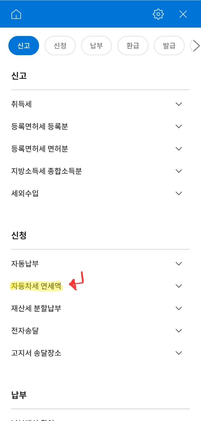- 앱 실행 → 로그인 → '신청' 메뉴 → '자동차세 연세액 선택 → 연세액납부 신청 → 차량정보 입력 → 신청 완료