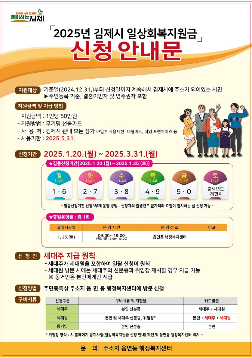 김제시 민생지원금 신청은 2025년 1월 20일부터 3월 31일까지 진행됩니다.