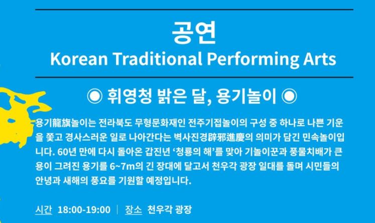 | 서울 | 남산골한옥마을 <휘영-청> | 2.24(토) | 서울 도심 한복판에서 액운을 쫓고 올 한 해 복을 기원 |